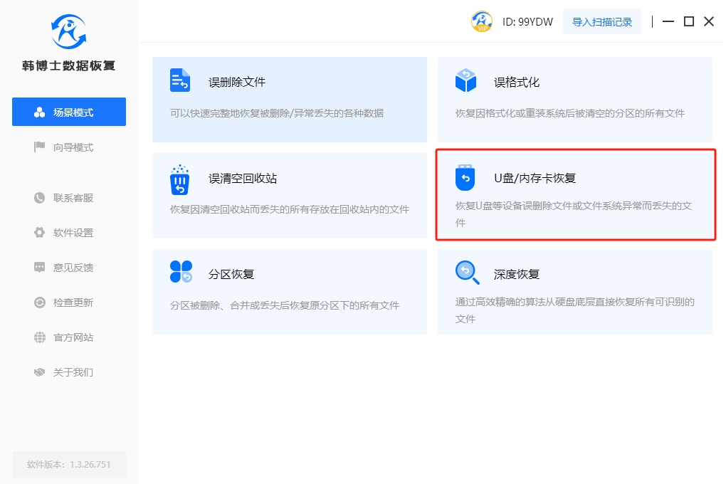 1. 先下載好韓博士數據恢復軟件到電腦桌面,然后雙擊啟動,點擊“場景模式”,選擇“U盤/內存卡恢復”。