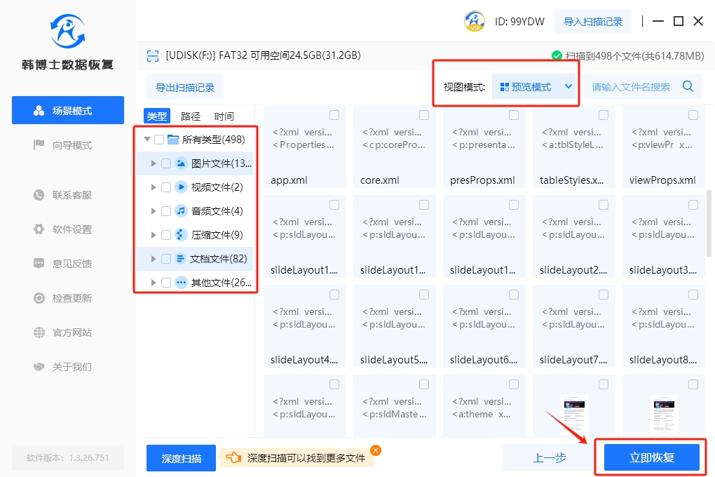 4. 完成掃描后,您可以先點擊“預覽模式”,確認文件是否正確,然后選擇您想要恢復的數據,最后再點擊“立即恢復”。