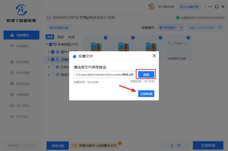 1. 打開韓博士數(shù)據(jù)數(shù)據(jù)恢復(fù)軟件,這是內(nèi)存卡數(shù)據(jù)恢復(fù)的必要步驟。然后,在軟件界面中找到“場景模式”,點擊“U盤/內(nèi)存卡恢復(fù)”。