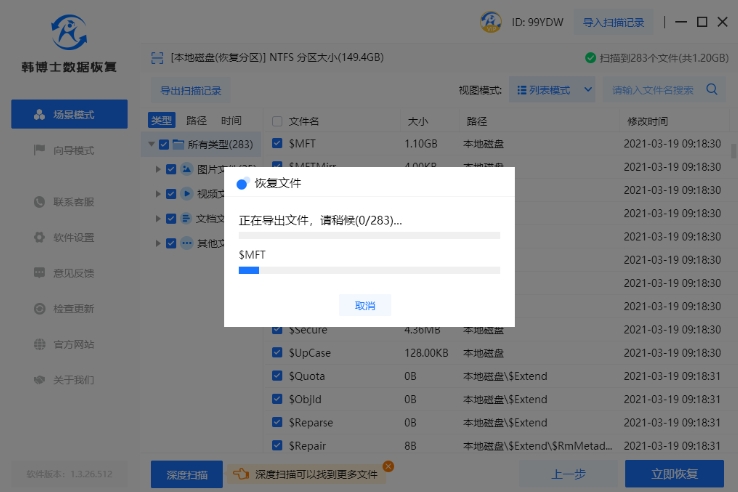3. 韓博士進行數(shù)據(jù)的掃描操作,這一過程無需您手動操作,只需等待掃描成功即可。掃描完成后,請選擇您需要恢復(fù)的文件,然后點擊“立即恢復(fù)”