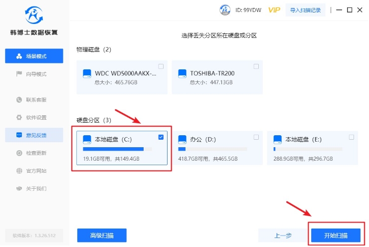 2. 在恢復數據前,請確保選擇了正確的硬盤分區,確認無誤后,點擊“開始掃描”,以啟動數據掃描流程。