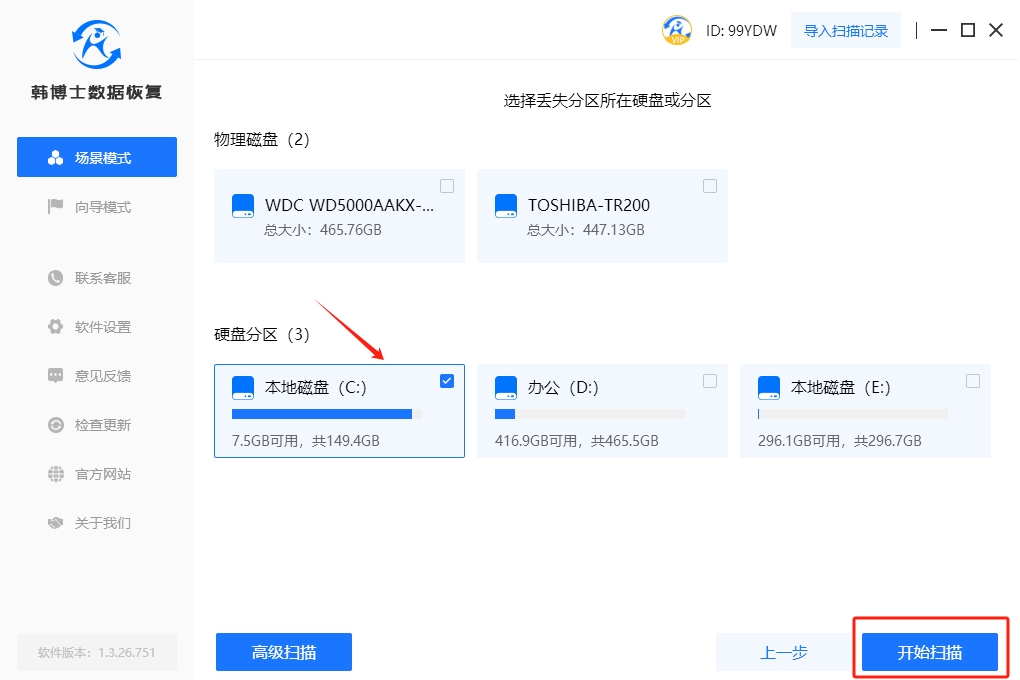 1. 在進行數據恢復之前,請確保您的計算機上已經安裝了韓博士數據恢復軟件。接著雙擊啟動韓博士,在“場景模式”下選擇“分區恢復”,來進行硬盤數據恢復。