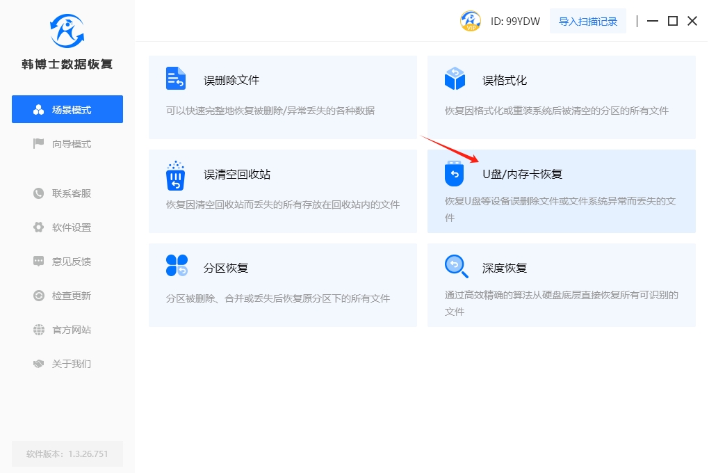 1. 先下載好韓博士數(shù)據(jù)恢復(fù)軟件到電腦桌面,然后雙擊啟動,點擊“場景模式”,選擇“U盤/內(nèi)存卡恢復(fù)”。
