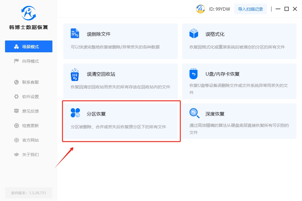 1. 在進行數據恢復之前,請確保您的計算機上已經安裝了韓博士數據恢復軟件。接著雙擊啟動韓博士,在“場景模式”下選擇“分區恢復”,來進行硬盤數據恢復。
