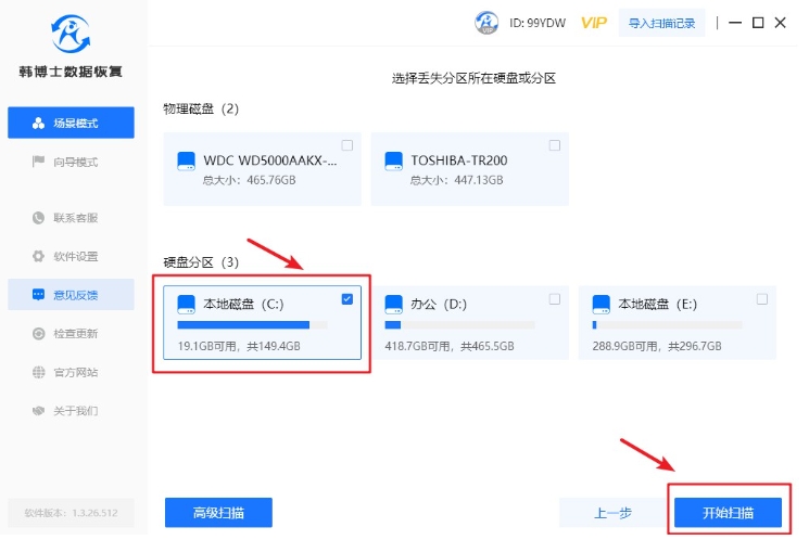 2. 根據特定的數據丟失,請找到硬盤的某個分區,然后單擊“開始掃描”按鈕。