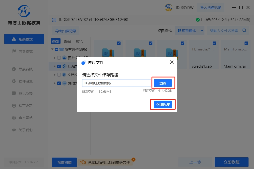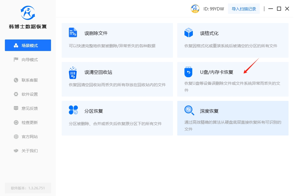 1. 打開韓博士數(shù)據(jù)恢復(fù)軟件,這是內(nèi)存卡數(shù)據(jù)恢復(fù)的必要步驟。然后,在軟件界面中找到“場景模式”,點擊“U盤/內(nèi)存卡恢復(fù)”。