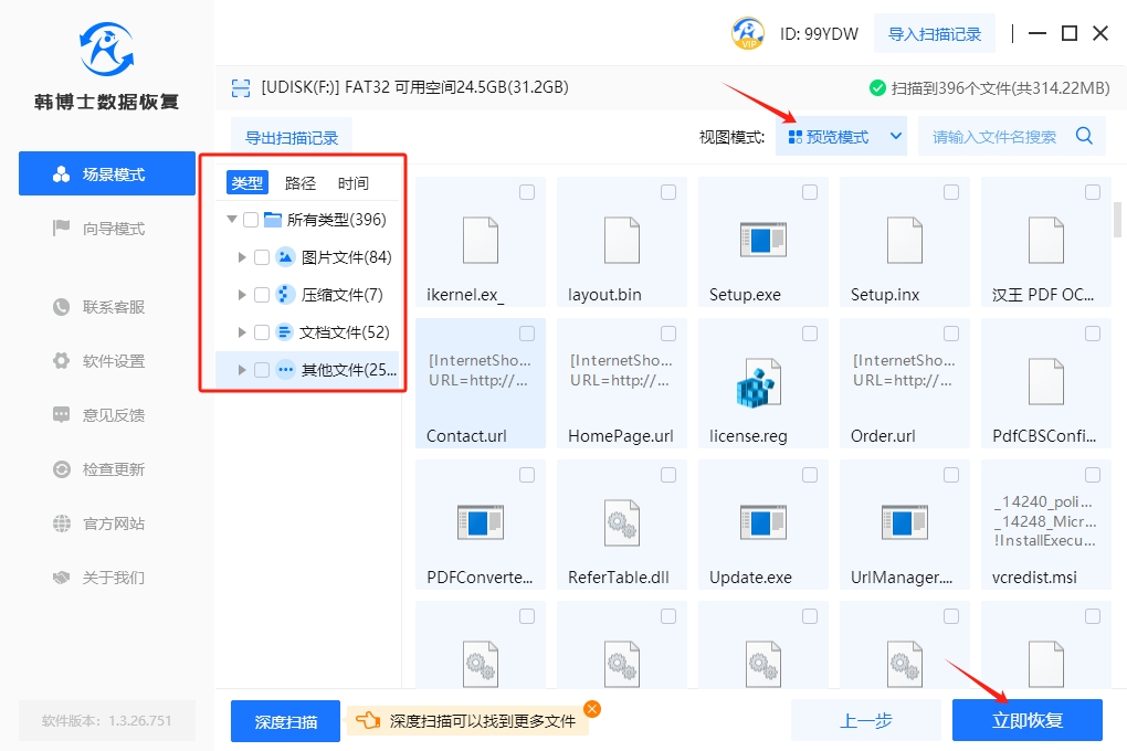 4. 掃描操作結束后,不要忘記點擊“預覽模式”,來檢查文件的準確性。確認文件正確無誤后,選中您想要恢復的文件,然后點擊“立即恢復”。