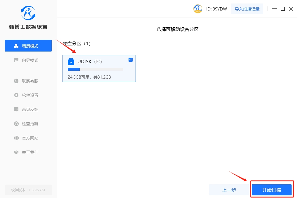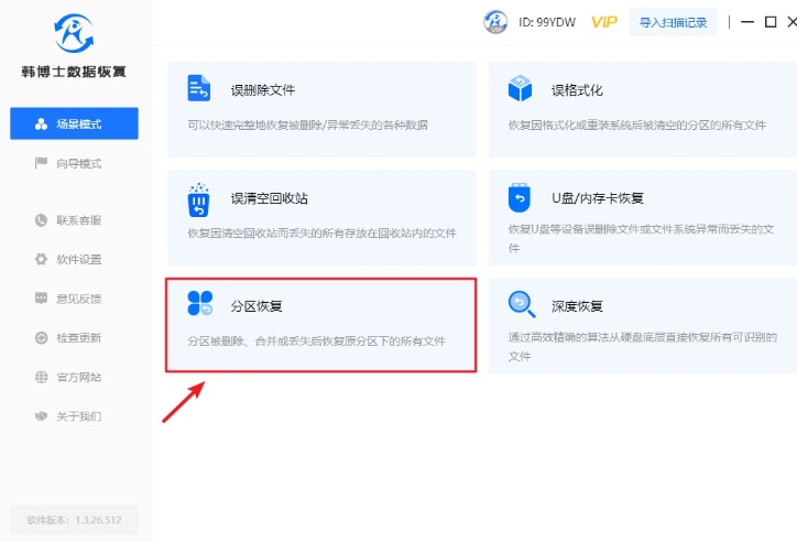 1. 下載并在計算機上安裝好韓博士數(shù)據(jù)恢復,之后選擇“場景模式”下的“分區(qū)恢復”,再繼續(xù)下一步的恢復操作。