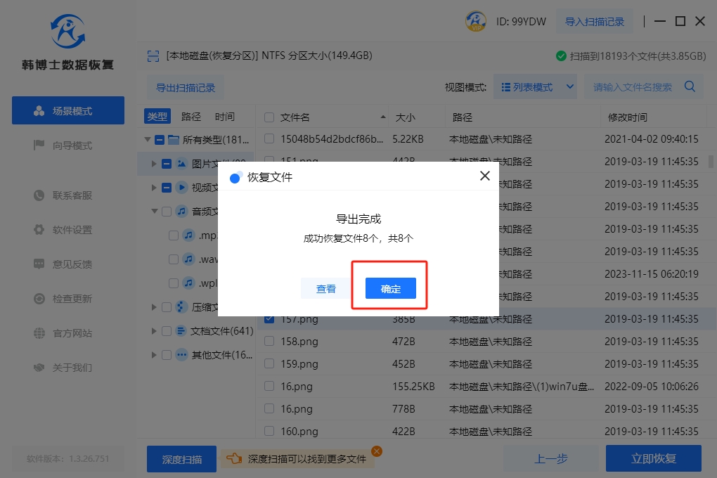 6. 來到了數(shù)據(jù)恢復的最后階段,點擊“確定”按鈕,這是韓博士成功完成整個恢復過程的最后一步。