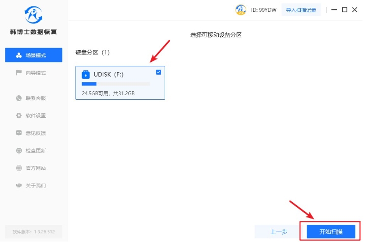 1. 要執行數據恢復操作,首先雙擊打開韓博士,進入軟件界面,然后找到“場景模式”,選擇“U盤/內存卡恢復”。