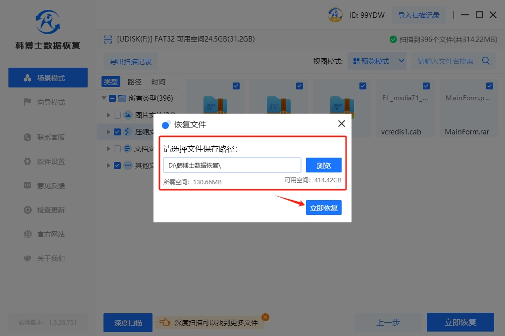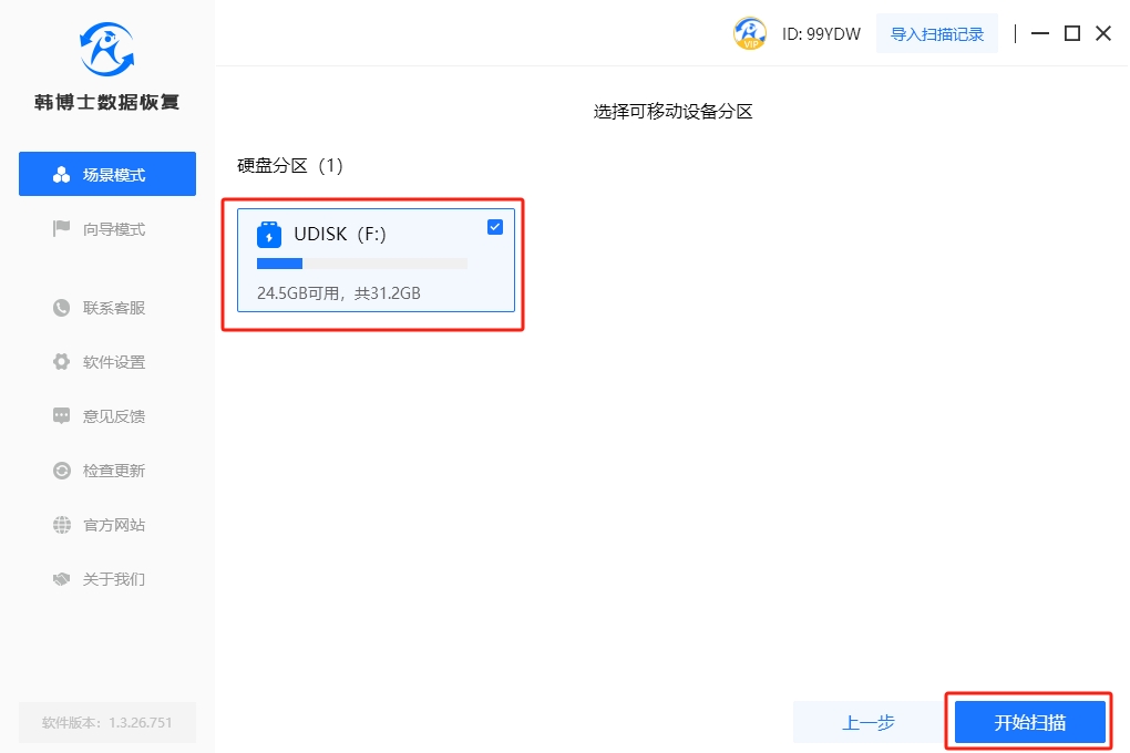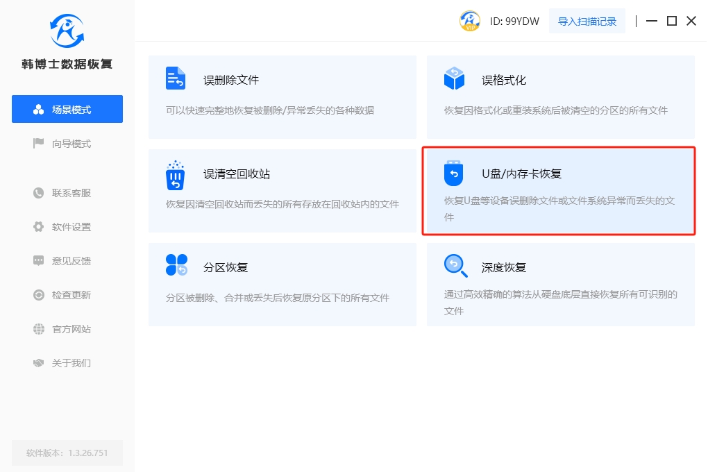 1. 打開韓博士數據恢復軟件,這是內存卡數據恢復的必要步驟。然后,在軟件界面中找到“場景模式”,點擊“U盤/內存卡恢復”。