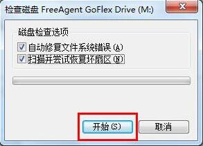 此時(shí)電腦會(huì)彈出檢查磁盤的窗口,同時(shí)勾選以下兩個(gè)選項(xiàng),最后點(diǎn)擊“開始”菜單。