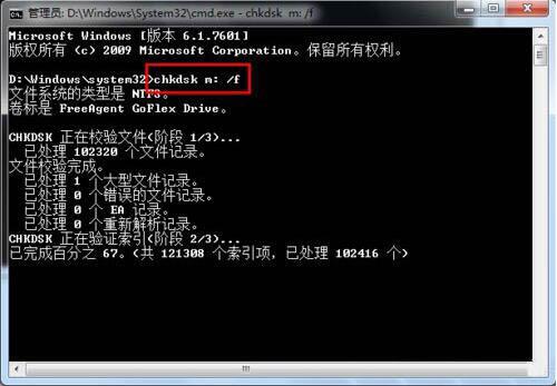 如果電腦修復(fù)之后還是無法打開可移動(dòng)磁盤,直接打開命令提示符,隨后在窗口中輸入命令:chkdsk m: /f(其中M代表磁盤對(duì)應(yīng)盤符)嘗試修復(fù)磁盤錯(cuò)誤。
