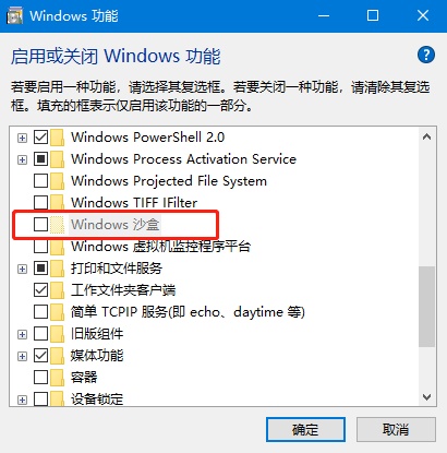 4.開始在彈出的windows功能界面中,直接勾選其中的windows沙盒復選框,最后點擊“確定”保存設置。