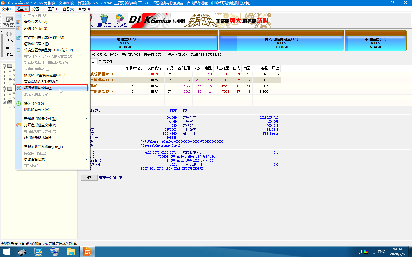 4.打開桌面上的分區(qū)工具,選中分區(qū)表壞了的硬盤,開始進(jìn)行“壞道檢測(cè)與修復(fù)”。