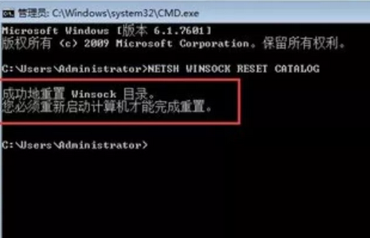 2.電腦會彈出對應的界面,直接輸入“NETSH WINSOCK RESET CATALOG”命令后回車就可以了。