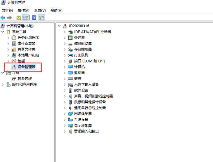1.打開計算機管理界面,選擇設備管理器進入。