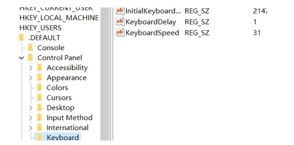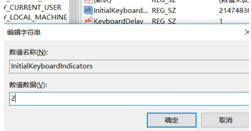 7.最后在Keyboard目錄中選擇InitialKeyboardIndicators,并輸入數值=2并點擊確定就可以解除鍵盤鎖定了。