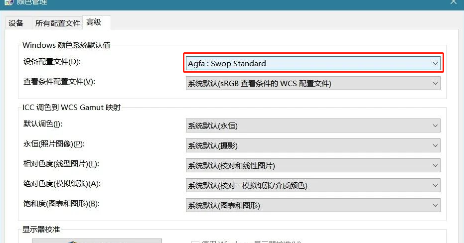 4.在高級標簽中,點擊設備配置文件,選擇Agfa:Swop Sandard。