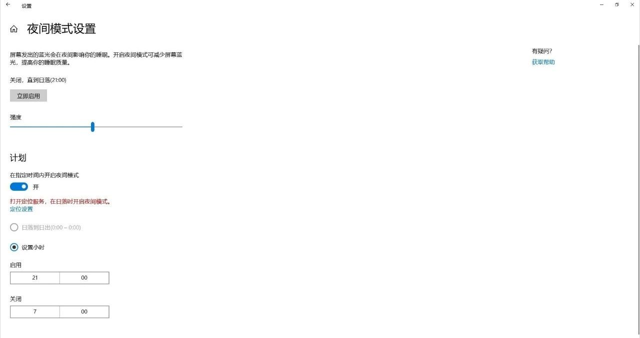 2.點擊夜間模式設置,進入具體的調整界面。立即啟用按鈕,會24小時開啟此模式,反之則點擊關閉。還可通過定位自動識別是否是夜晚,也可自己設置時段,到時會自動打開和關閉。
