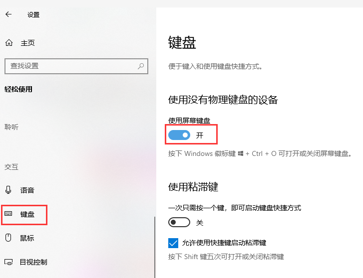 2.將窗口切換到“鍵盤”,開啟“使用屏幕鍵盤”win10軟鍵盤會自動跳出來。