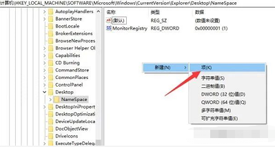 2.打開注冊表編輯器,依次展開【HKEY_LOCAL_MACHINE】→【SOFTWARE】→【Microsoft】→【W(wǎng)indows】→【CurrentVersion】→【Explorer】→【DeskTop】→【NameSpace】。然后右擊右側(cè)空白處,新建項(xiàng)。