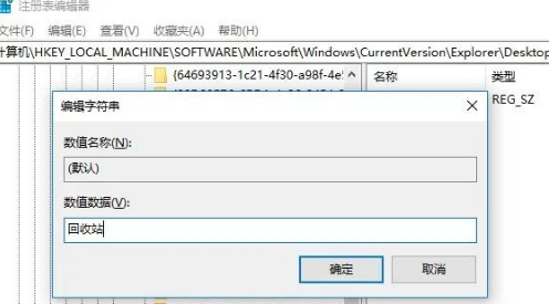 6.彈出編輯字符串窗口,數(shù)值數(shù)據(jù)修改為回收站,點(diǎn)擊確定。重啟電腦即可。
