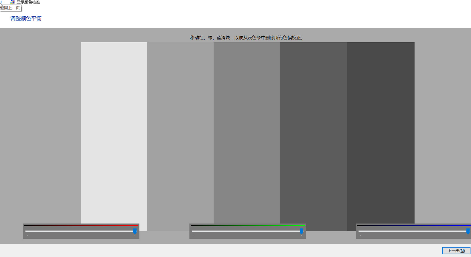 3.到最后的移動紅、綠、藍滑塊,以便從灰色條中刪除所有色調(diào)校正界面下,可以看到,出現(xiàn)的三色默認值都是最亮的狀態(tài)(最靠右)。此時可以根據(jù)自身需求調(diào)整紅、綠兩色(注意要同時調(diào)整),藍色的部分不要調(diào)節(jié),確定顏色后,點擊下一步,然后即可完成。