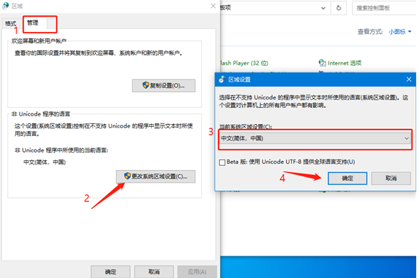 3、接著切換到“管理”菜單下,點擊“更改系統區域設置”,把當前系統區域設置更改為“中文(簡體,中國)”,最后點擊“確定”。