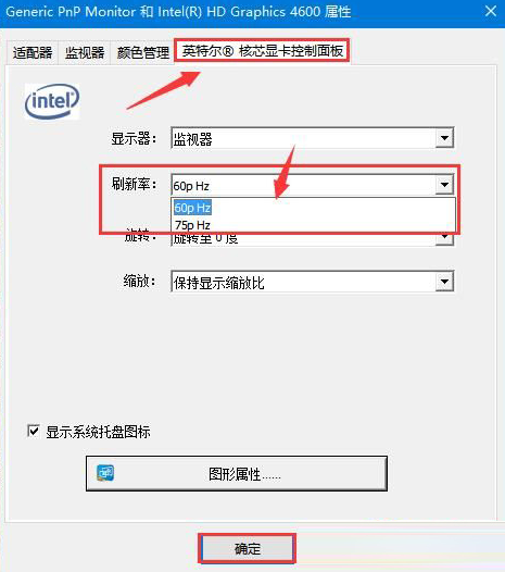 4、接下來會彈出顯示適配器的屬性窗口,小編以英特爾顯示適配器為例,切換至“英特爾核芯顯卡控制面板”,然后調(diào)整刷新率,找到合適的刷新率即可點擊“確定”。