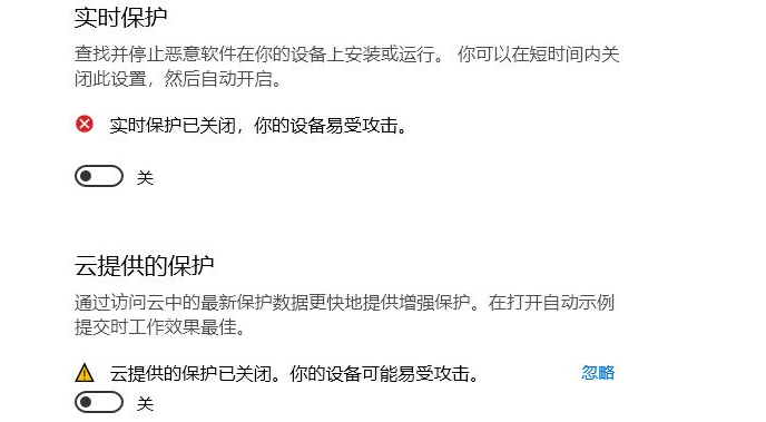 5、現(xiàn)在可以看到“實(shí)時(shí)保護(hù)”和“云提供的保護(hù)”是開(kāi)啟的狀態(tài),將其關(guān)閉即可。