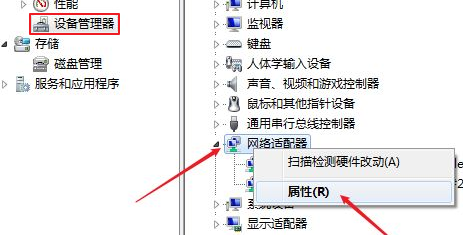 2、左側點擊“設備管理器”,然后右側找到“網絡適配器”,右鍵單擊選擇“屬性”。