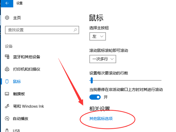 3、此時進入設備設置界面,再左側欄點擊“鼠標”,然后在右側界面點擊“其他鼠標選項”。
