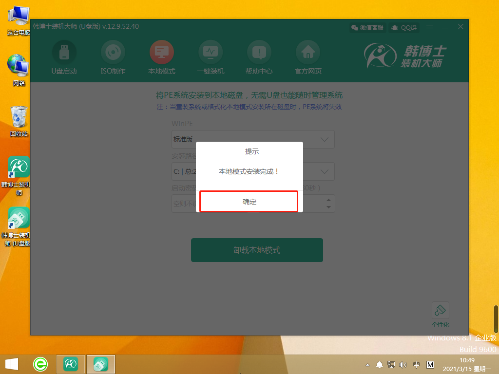 韓博士將下載PE鏡像文件,下載完成后,本地模式安裝完成。