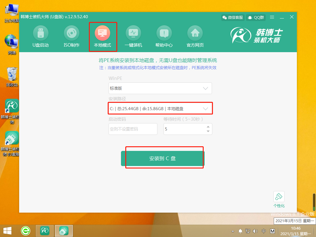 1.打開韓博士裝機(jī)大師,選擇“U盤啟動”中的 “本地模式”