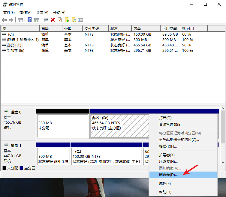 2. 進入磁盤管理,鼠標右鍵單擊想要重新分區的磁盤選擇“刪除卷”,刪除之后就可以開始重新分區了
