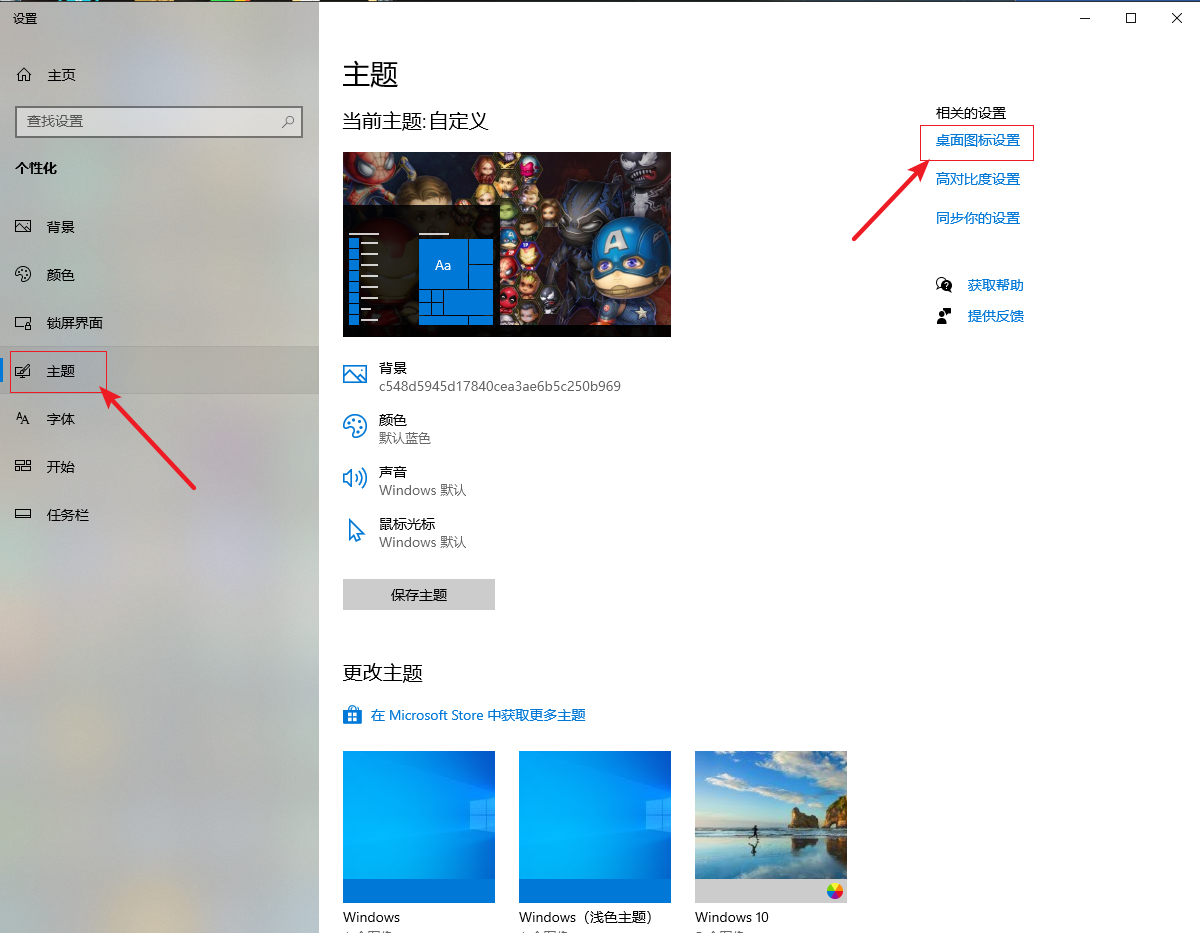 2.進入個性化設置窗口,先在左側選擇【主題】,然后在右側點擊【桌面圖標設置】。
