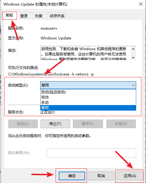 3.雙擊進入Windows Update屬性界面,選擇【常規】,將【啟動類型】設置為【禁用】,然后點擊【應用】,最后點擊【確定】即可。
