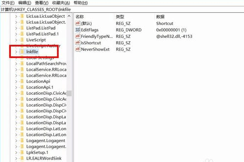 2.在注冊(cè)表編輯器里找到HKEY_CLASSES_ROOT\lnkfile,也可按下Ctrl+F快捷鍵搜索“l(fā)nkfile”,快速找到HKEY_CLASSES_ROOT\lnkfile。