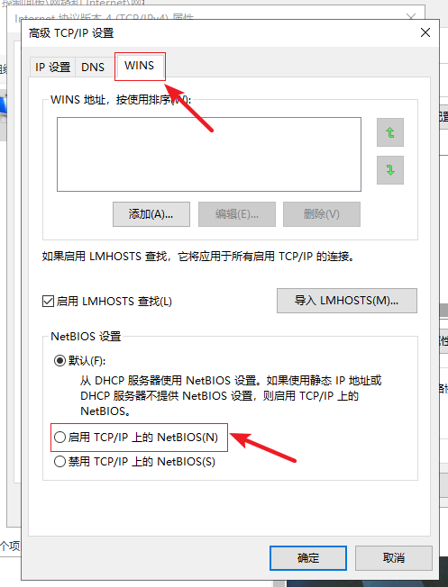 6.在上方點擊【WINS】選項卡,然后在下方選擇【啟用TCP/IP上的NetBIOS】。