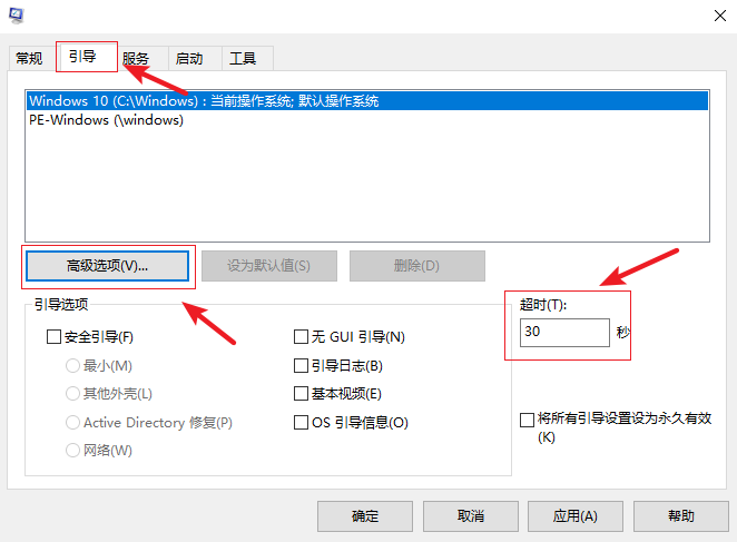 2.進入以下界面,上方切換到【引導】選項卡,把【超時】設置為【30】秒,然后點擊【高級選項】。