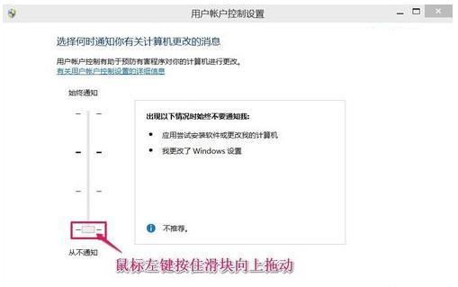 2.進(jìn)入用戶帳戶控制設(shè)置窗口,用鼠標(biāo)把左邊的滑塊往上拉至默認(rèn)的位置,然后點(diǎn)擊【確定】。