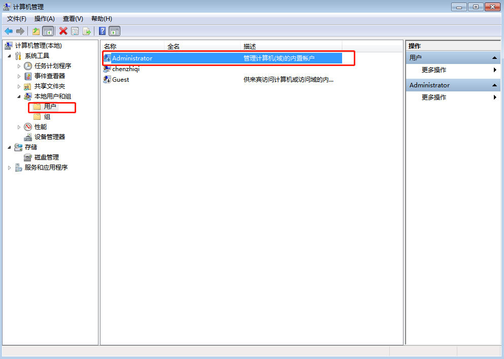 1.右鍵點擊“計算機”圖標中的“管理”進入,在出現的管理界面中依次展開“系統工具”-“本地用戶和組”-“用戶”,雙擊打開其中的administrator賬號。