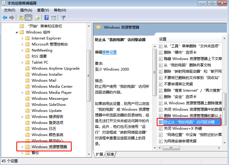 2.在本地組策略編輯器界面中依次點擊“用戶配置”-“管理模板”-“windows資源管理器”,在右側找到“防止從“我的電腦”訪問驅動器”,如圖所示: