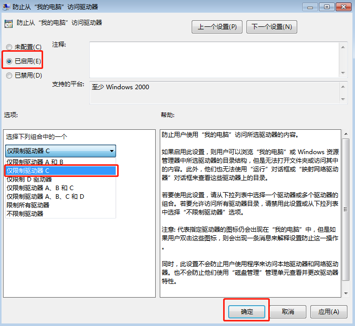 3.雙擊打開該項,隨后將其設置為“已啟用”,選擇“僅限制驅動器C”,最后點擊“確定”即可。
