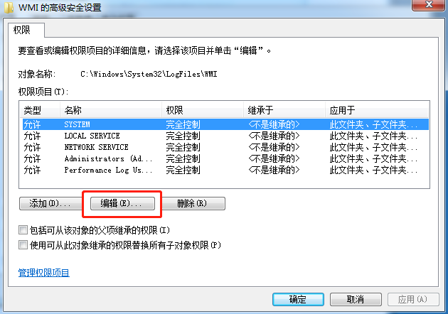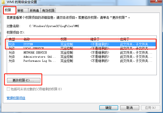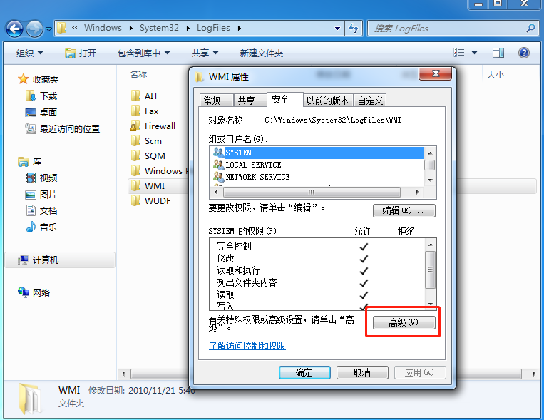 2.找到并右鍵選中“WMI文件夾”,打開“屬性”,直接獲得永久管理員的權限。開始選擇“安全”下的“高級”,如圖所示:
