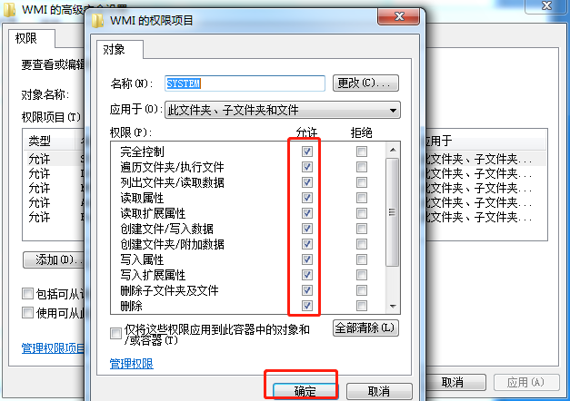 5.在彈出的權限項目窗口中勾選完全控制下的所有復選框,最后點擊“確定”。