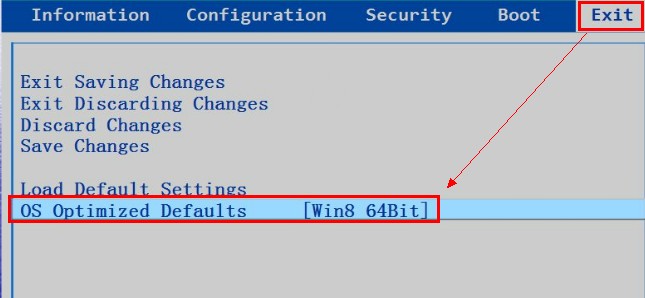 1.將聯想筆記本電腦重啟或者開機,在開機自檢處連續按下“F2”(一般情況)進入bios設置界面,直接用左右移動鍵將鼠標切換至“exit”選項,在OS Optimized Defaults [Win8 64Bit]選項中按回車,將“Win8 64Bit”換成“disabled”,如圖所示: