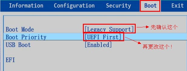2.隨后使用左右鍵移動至“boot”,將“Boot Mode”后設置為“Legacy Support”,隨后使用上下鍵切換至“Boot Priority”,回車設置其為“Legacy First”。