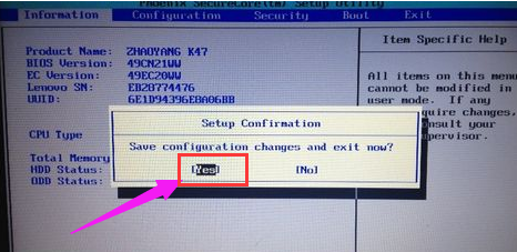 3.對bios進(jìn)行簡單設(shè)置后,大家需要按下“F10”保存當(dāng)前設(shè)置。在彈出的窗口中使用鍵盤按鍵選擇“yes”并按下回車鍵即可保存。